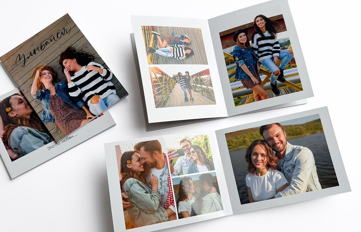 Фотокнига с небольшим количеством разворотов - от 1 до 9, с плотными страницами из фотобумаги в твердой обложке.